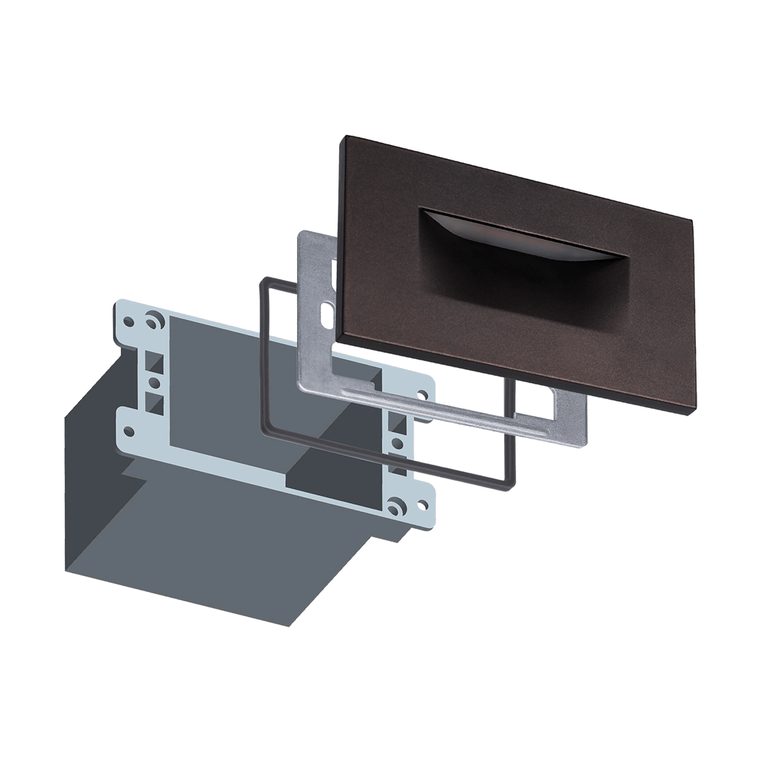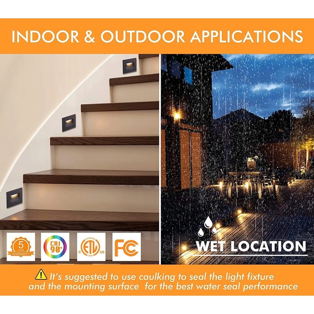 The size of this horizontal LED step light is 2.875 (H) x 4.75” (W) x 1.5” (D). It's the perfect size for a standard bell box, so its location can be pre-installed and wired and ready for the fixture installation. This rectangular step light has a waterproof rating of IP65 so the moist weather won't be a fact to damage. The short cable is connected from its backside for low voltage connection. This high-quality product will serve you greatly.